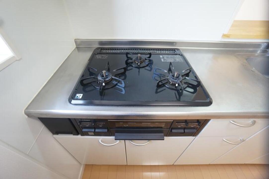 エレベーター、プロパンガス、光ファイバー、防犯カメラ、24時間電話受付、オートロック、駐輪場、温水洗浄便座(シャワートイレ)、洗髪洗面化粧台(シャンプードレッサー)、システムキッチン、カウンターキッチン、ガスコンロ、クローゼット、室内洗濯機置場、浴室テレビ、照明器具、エアコン、モニター付インターホン、24時間換気、バス・トイレ別