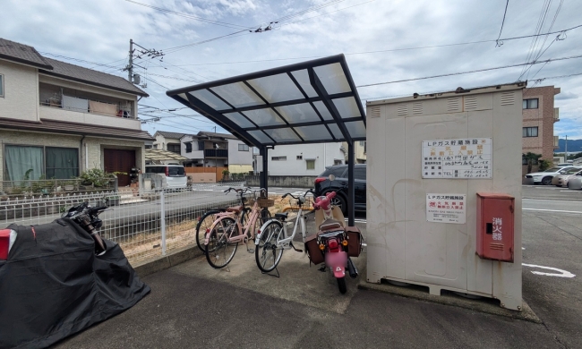 | プロパンガス、光ファイバー、駐輪場、温水洗浄便座(シャワートイレ)、室内洗濯機置場、照明器具、エアコン、南向き、バス・トイレ別、室内物干 |