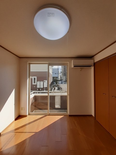 プロパンガス、防犯カメラ、24時間電話受付、駐輪場、温水洗浄便座(シャワートイレ)、追焚、カウンターキッチン、クローゼット、床下収納、シューズボックス、室内洗濯機置場、照明器具、エアコン、BSアンテナ、モニター付インターホン、メモリーキー(オプナスキー等)、バルコニー、暖房便座、1階、最下階、保証人不要、南向き、全室フローリング、バス・トイレ別
